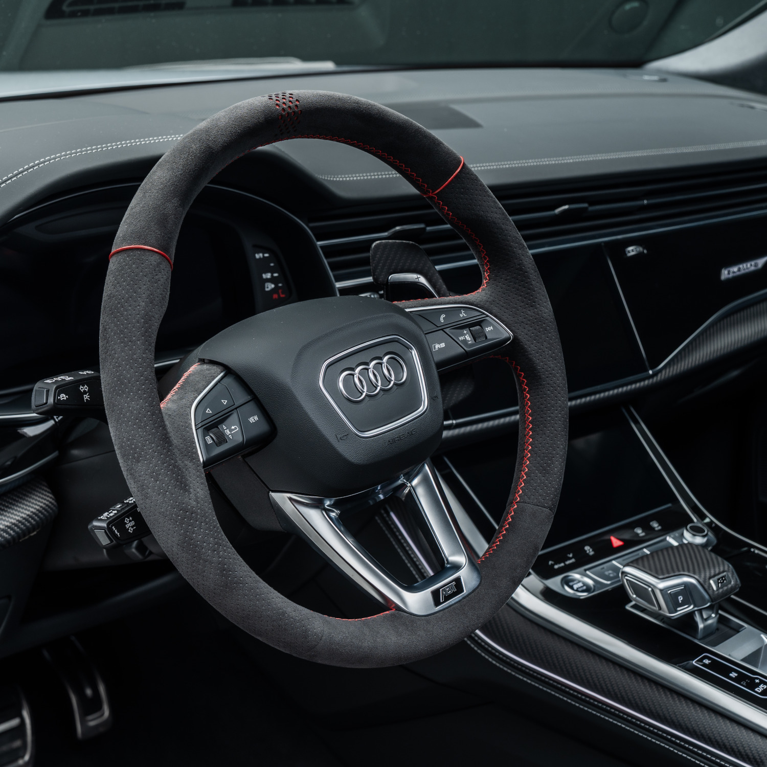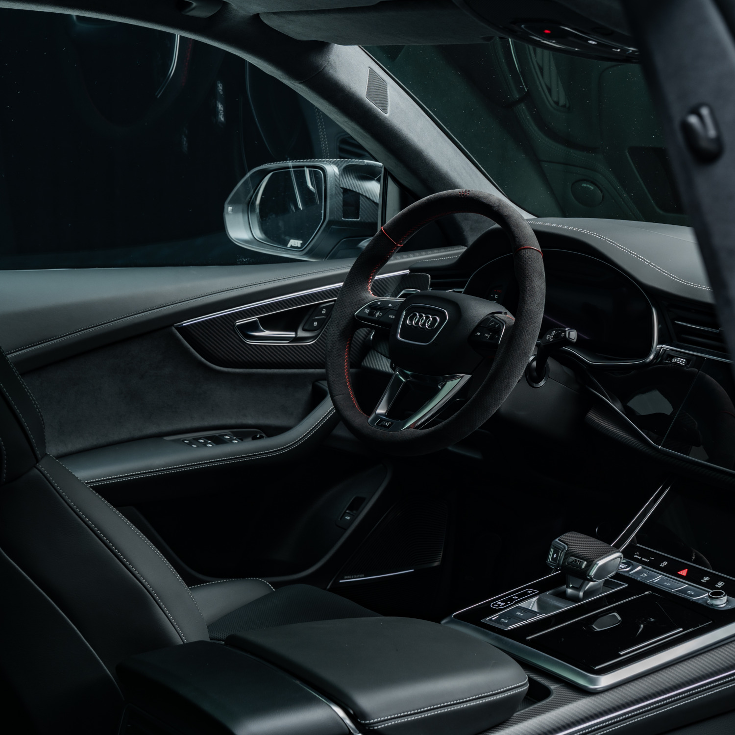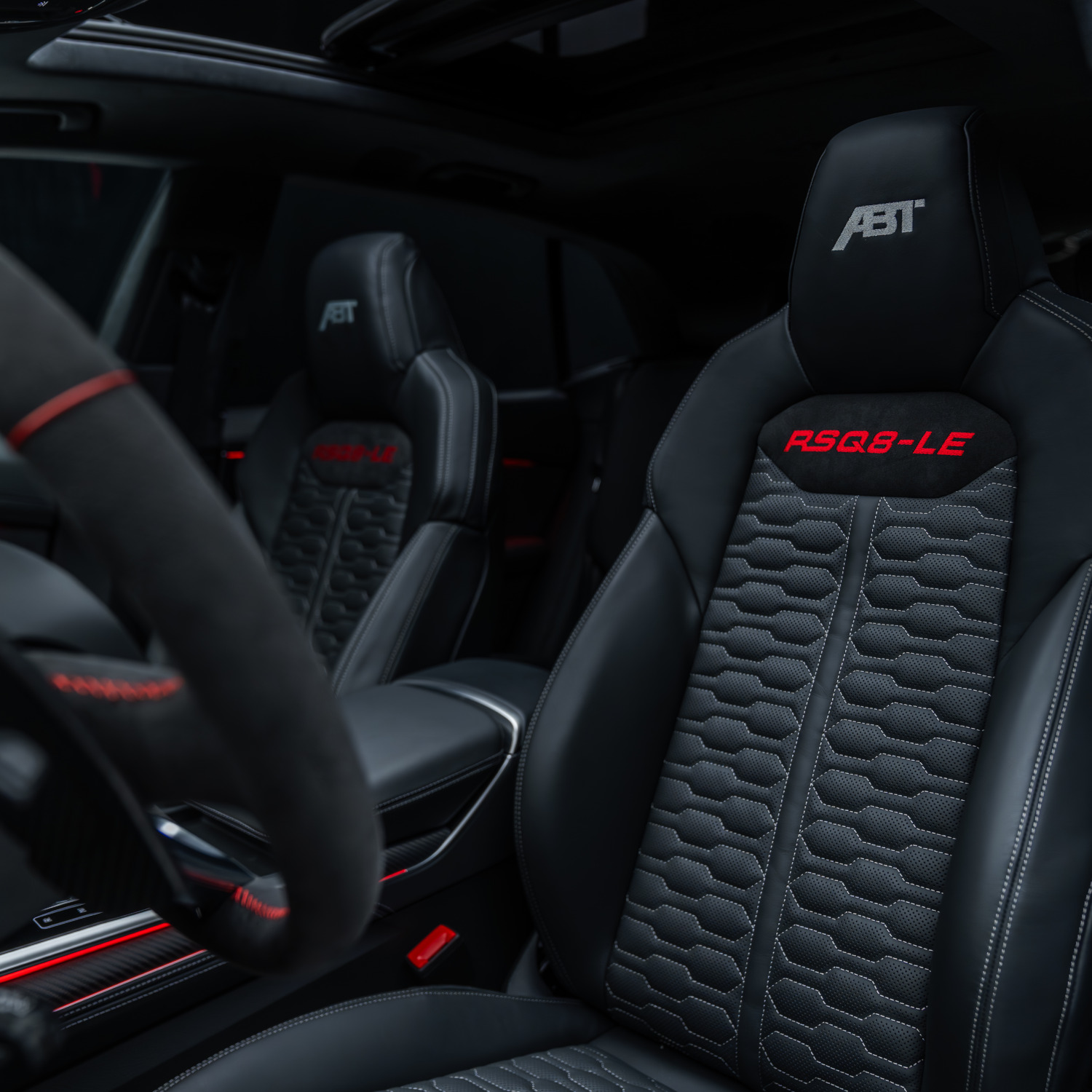 Exclusive materials and handcrafted finishes await you in the interior, making every moment a special experience. The ABT sports steering wheel covered in Alcantara, the carbon-fibre shift paddles and the elegant interior applications create an atmosphere of sporty luxury. Further details such as the logos embroidered into the headrests, the elegant ABT door sill trims, RSQ8-LE floor mats and much more testify to the exclusivity of this Limited Edition.