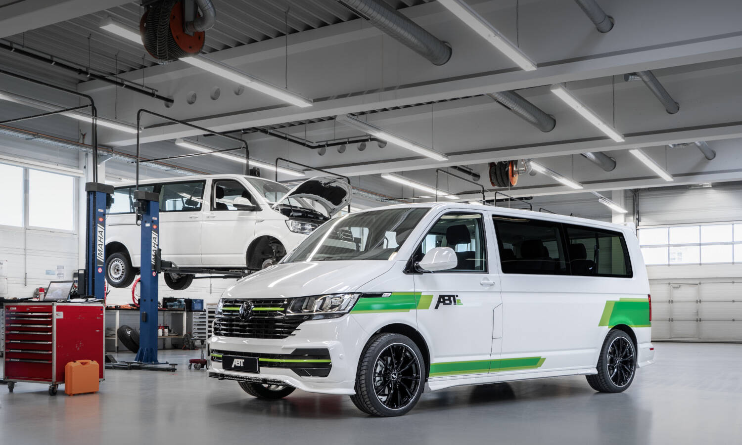 The exciting electromobility sector has been a part of ABT Sportsline’s day-to-day business for over a decade – with involvement in Formula E on the racetrack as well with road vehicles. “We have always considered change as opportunity rather than risk”, says Hans-Jürgen Abt. The initial pilot projects led to the creation of ABT e-Line GmbH, which today operates as a premium partner of Volkswagen Commercial Vehicles, among others. The first major project in this configuration was the ABT e-Caddy. Next came the ABT e-Transporter, which is produced officially on the basis of the VW T6.1. Now the focus is on the future again: In conjunction with the university in Kempten, the ABT specialists are investigating fuel cells.