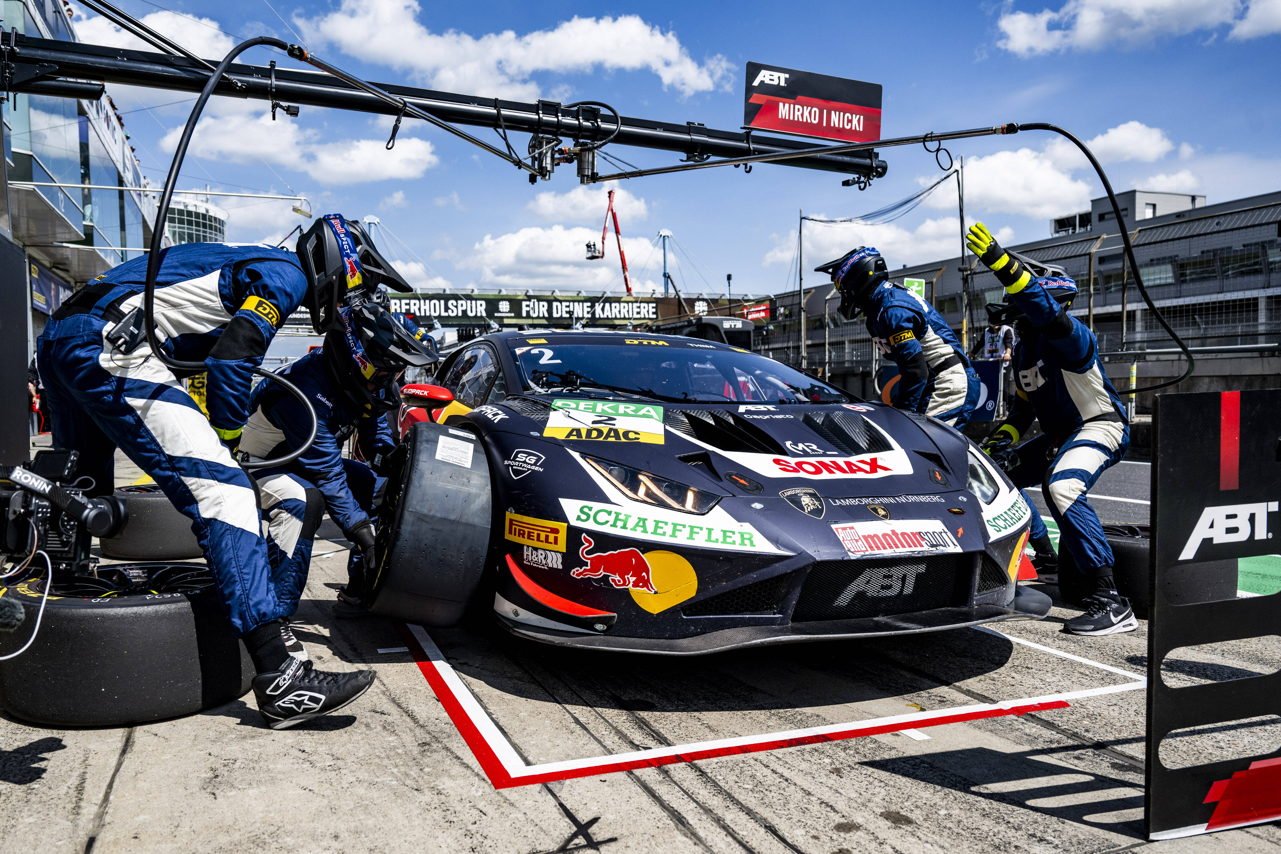 The first race on Saturday was particularly bitter: after a good start, Mirko Bortolotti was knocked out of the race by René Rast after the first corner. The oil cooler of his Lamborghini Huracán was damaged, which in turn resulted in a costly engine failure. The team had to bring a replacement engine from Kempten, which arrived in the Eifel shortly before midnight. The subsequent installation of the new engine lasted until 6 AM on Sunday morning.