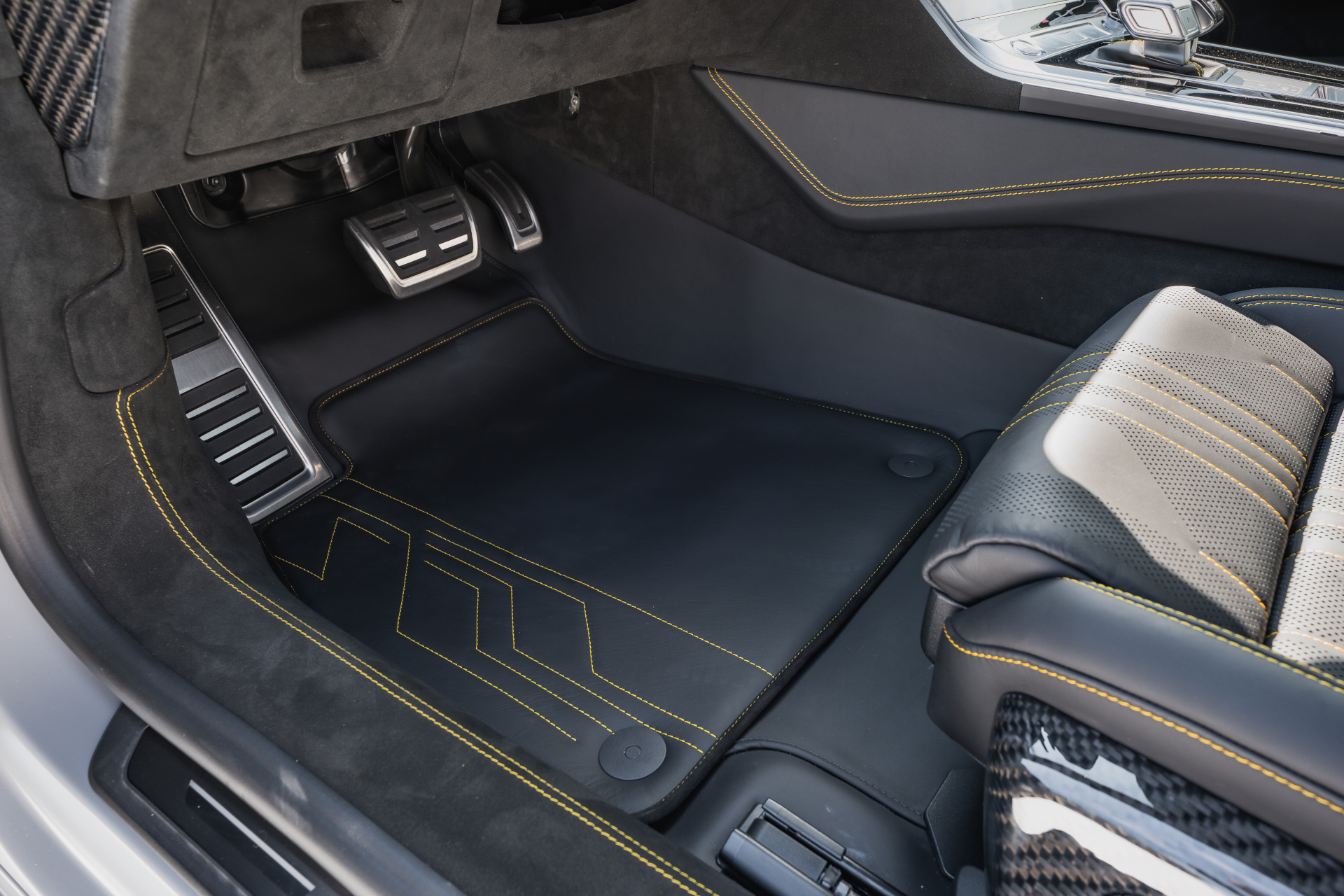 Another, but no less high-quality option is a discreet black interior, in which a strikingly coloured perforation pattern - here in yellow - which is repeated in specific places, attracts attention.