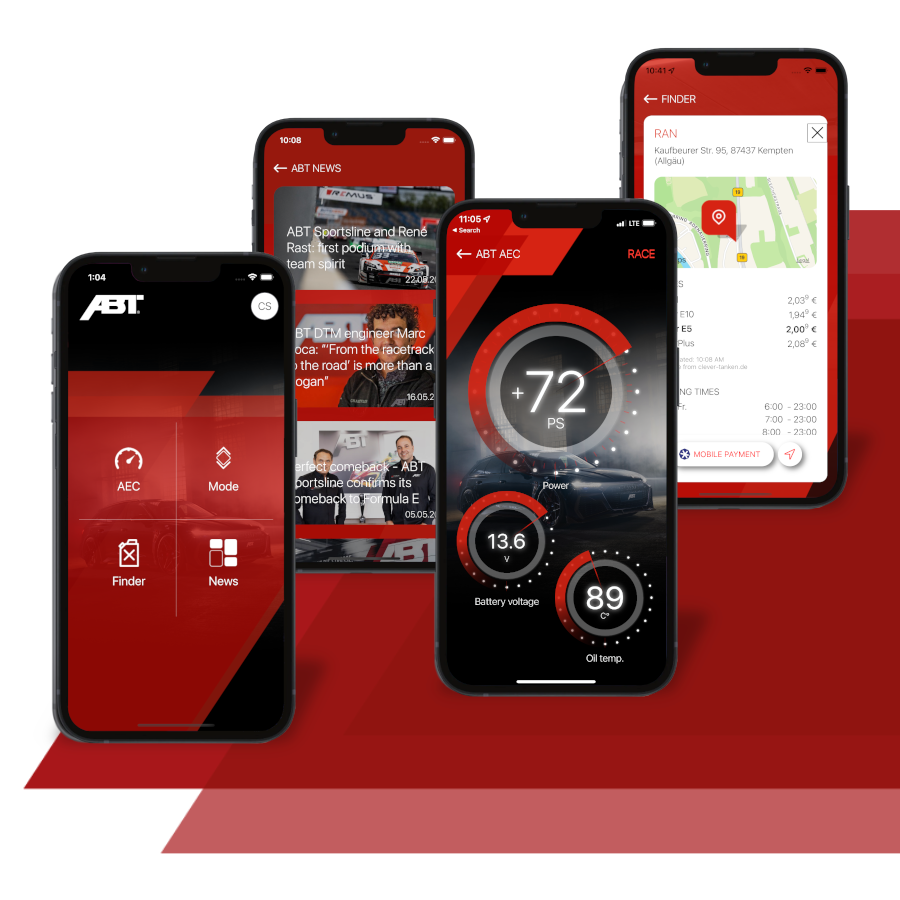 Basic functions, such as the practical petrol station finder and the display of the latest ABT news, are also available to you without a connection to your ABT Engine Control. For all other features, your AEC must have the corresponding compatibility. We are continuously working on upgrading our control units accordingly.